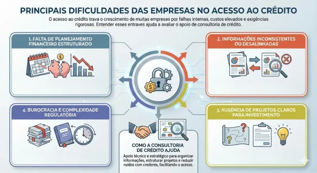 Entender esses entraves ajuda a avaliar quando a consultoria de crédito entra como apoio técnico e estratégico na organização das informações e dos projetos apresentados.